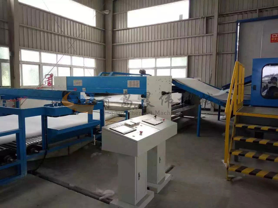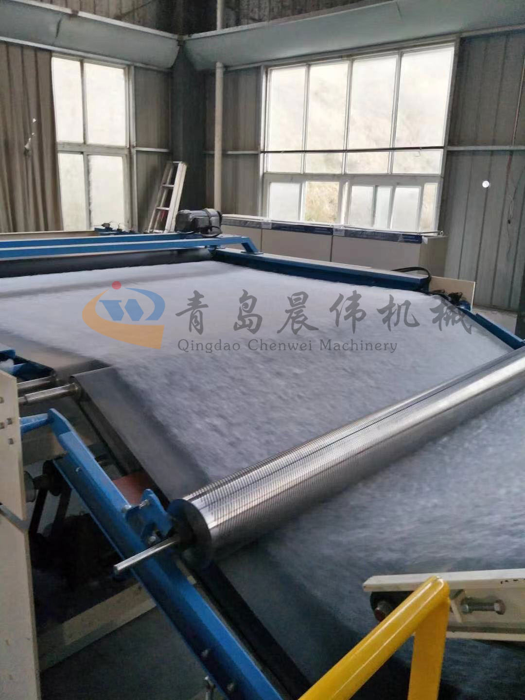 5. CWPW-鋪網(wǎng)機:用于將梳理纖網(wǎng)通過移動小車交叉折疊為所需幅寬和定量的多層纖網(wǎng),以供后道工序使用。鋪網(wǎng)輥采用特殊結構,加裝壓網(wǎng)輥和導流板,不飄網(wǎng)不起皺,五只大功率電機精確控制各部件的運動,電動輸出簾高度調節(jié)裝置