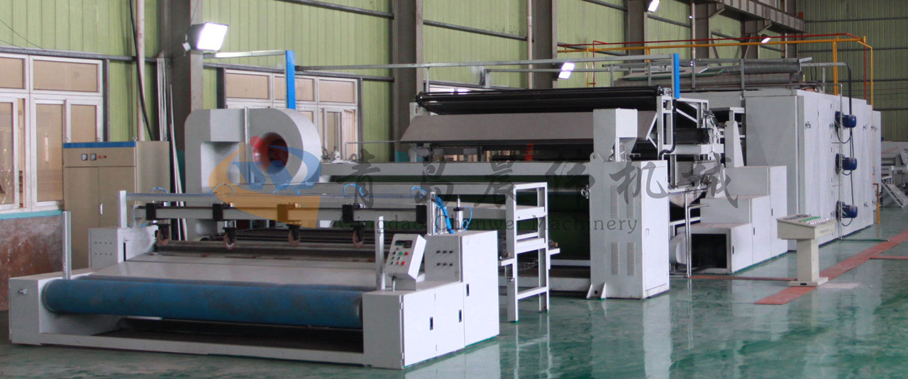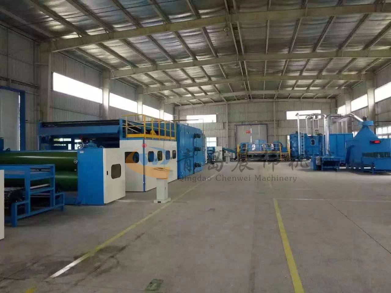 開包機(jī)-開松機(jī)-振動(dòng)給棉機(jī)-梳理機(jī)-鋪網(wǎng)機(jī)-烘房-燙光機(jī)-成卷切片機(jī)