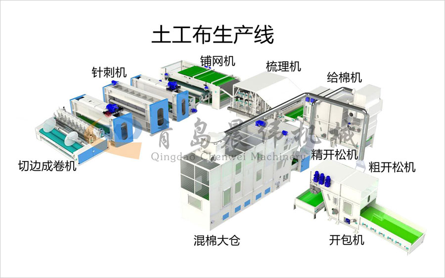 開(kāi)包機(jī)-開(kāi)松機(jī)-振動(dòng)給棉機(jī)-梳理機(jī)-鋪網(wǎng)機(jī)-針刺機(jī)-切邊成卷機(jī)