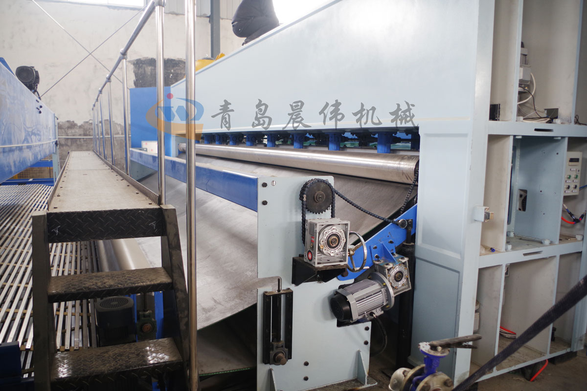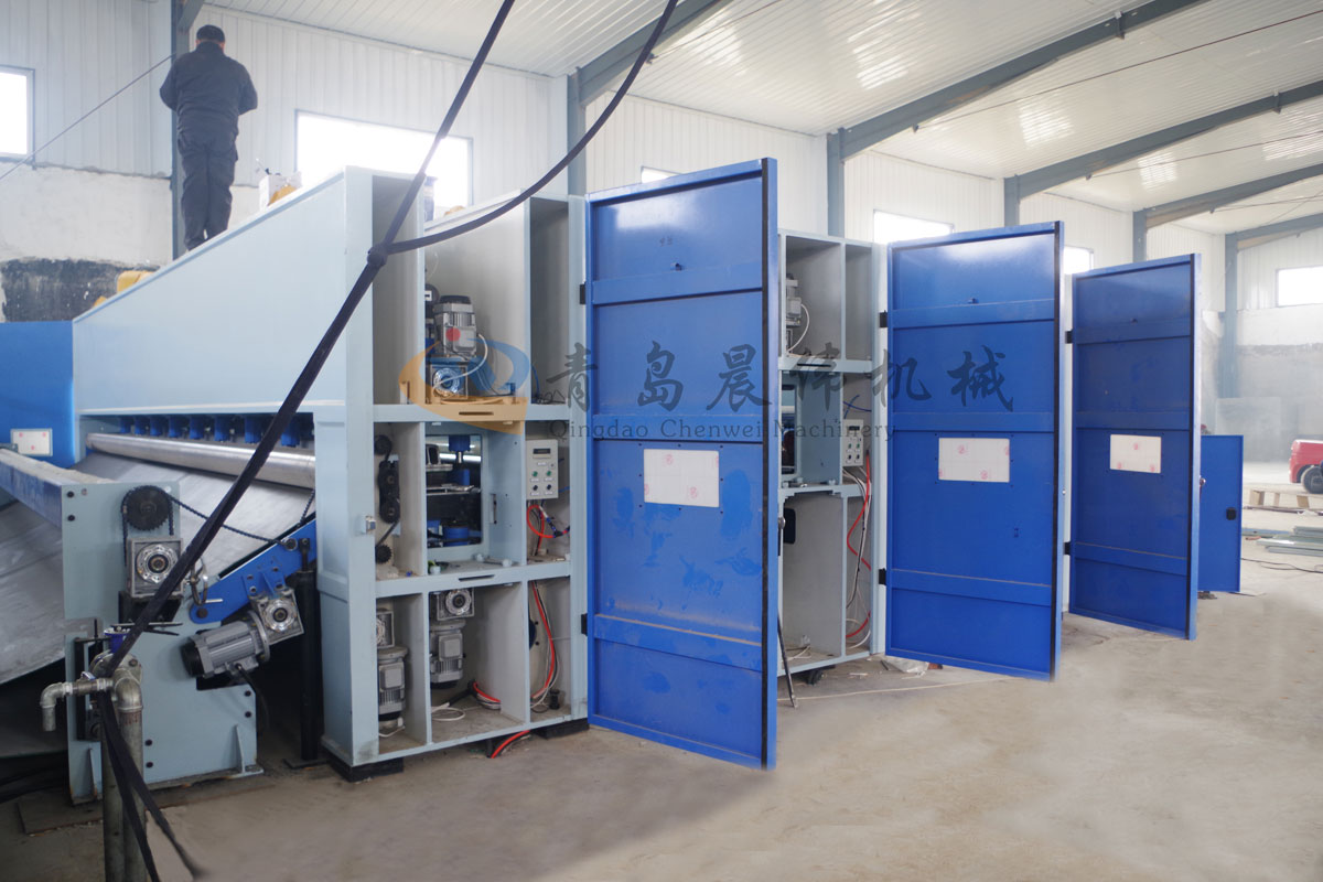 5. CWPW-鋪網(wǎng)機(jī):用于將梳理纖網(wǎng)通過(guò)移動(dòng)小車(chē)交叉折疊為所需幅寬和定量的多層纖網(wǎng),以供后道工序使用。鋪網(wǎng)輥采用特殊結(jié)構(gòu),加裝壓網(wǎng)輥和導(dǎo)流板,不飄網(wǎng)不起皺,五只大功率電機(jī)精確控制各部件的運(yùn)動(dòng),電動(dòng)輸出簾高度調(diào)節(jié)裝置